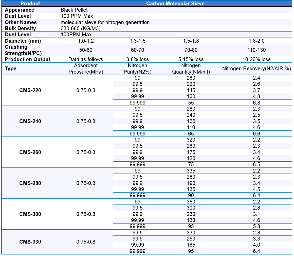 Xintao carbon molecular sieves have a wide variety of types for you to choose. Such as CMS -220, CMS-240, CMS-260, CMS-280, CMS-300, CMS-330.