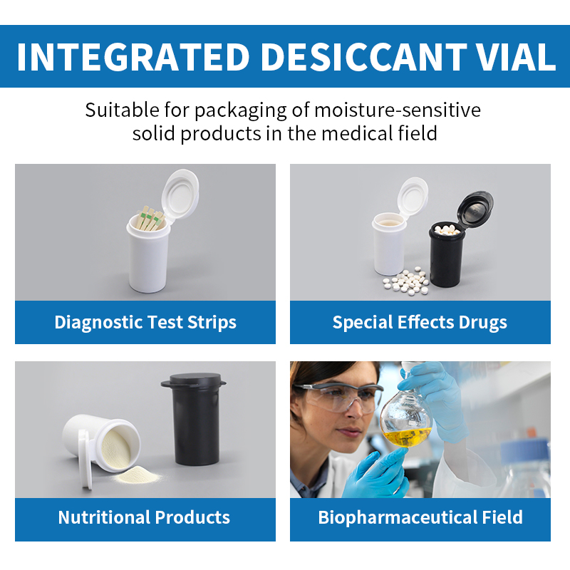DHF-I embedded desiccant vials are widely used in the packaging of solid products in the medical field, it integrates desiccants into vials to achieve excellent moisture barrier and absorption functions. For example, diagnostic test strips, special drugs, nutritional products (such as probiotics), biopharmaceuticals and other fields.