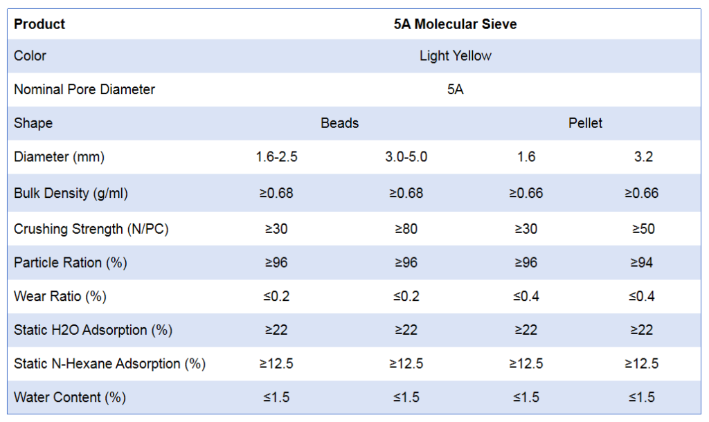 The strong ionic force of divalent calcium cations makes 5A an excellent choice for removing moisture, carbon dioxide, carbon monoxide, alcohols and other oxygen-containing compounds, hydrogen sulfide, methyl mercaptan and ethyl mercaptan, and other polar molecules.