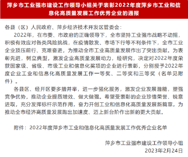 Jiangxi Xintao Technology Co., Ltd. has been honored with the Second Prize in the High-Quality Development of Industry and Information Technology award by Pingxiang City. The recognition occurred during the city’s Industrial Strengthening Initiative Promotion Conference held on February 24th, where 117 outstanding enterprises received awards from the Municipal Bureau of Industry and Information Technology.